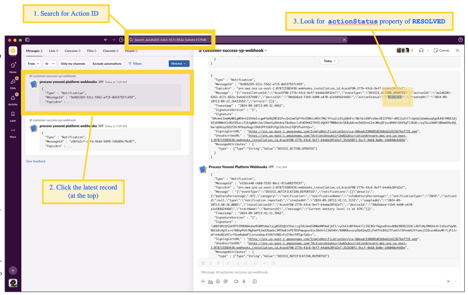 - Review the message to find the actionStatus property. It will be set to RESOLVED for a successful request.