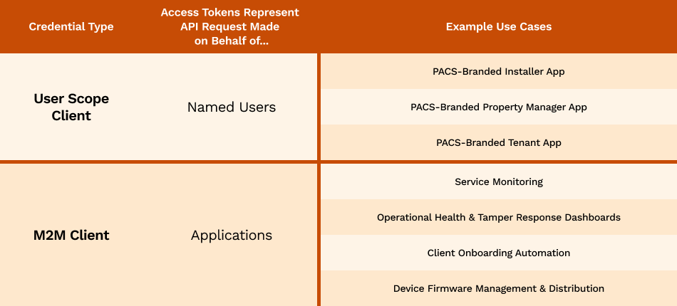 User Scope Clients and M2M Clients are intended to be used to build different applications and have different API access scopes that limit their use across use cases. The table below explains different use cases recommended for each client type.